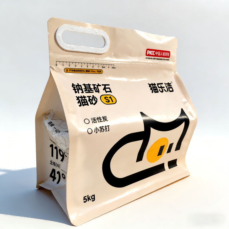 Struktur penyegelan delapan sisi menjaga tas tetap stabil dan tegak, ideal untuk pajangan rak yang menonjol. Ini juga memfasilitasi penumpukan yang stabil dan penyimpanan yang nyaman. Pegangan ritsleting memberikan segel yang aman dan andal, mencegah masuknya kelembapan dan debu bahkan dengan pembukaan dan penutupan berulang kali. Selain itu, desain pegangan plastik yang diperkuat memudahkan penanganan kotoran kucing seberat 5kg, sehingga meningkatkan pengalaman pengguna.